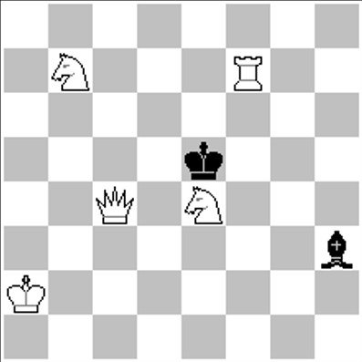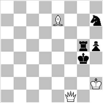 #3 (3+4) | Solução: 1.Rg2 ~ 2.Df3+ 1…Rh4+ 2.Rf3 1…Cf6 2.Dxf6 1…Tf5 2.Dd1+ A solução escrita dessa forma recebe os 5 pontos integrais. A ameaça e cada variante recebem 1.25 pontos cada. O lance 1…Cf8 negro não precisa ser mencionado, pois não constitui uma defesa contra a ameaça. |