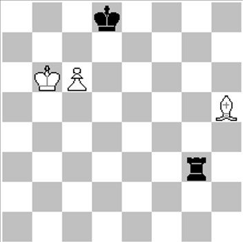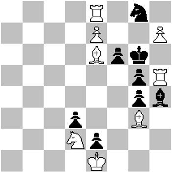 #4 (5+1) | Solução: 1.Bg4 1…Rg6 2.Te7 Rxg5 3.Tg7+ 1…Rf7 2.Bh5+ Rg7 3.Cf5+ 1…Rh7 2.Bh5 Rg7 3.Cf5+ Não há ameaça aqui, apenas as variantes que se seguem a cada lance preto são escritas. Os pontos poderiam ser distribuídos dessa forma: 1 variante correta: 1,7 ponto 2 variantes corretas: 3,4 pontos 3 variantes corretas: 5 pontos